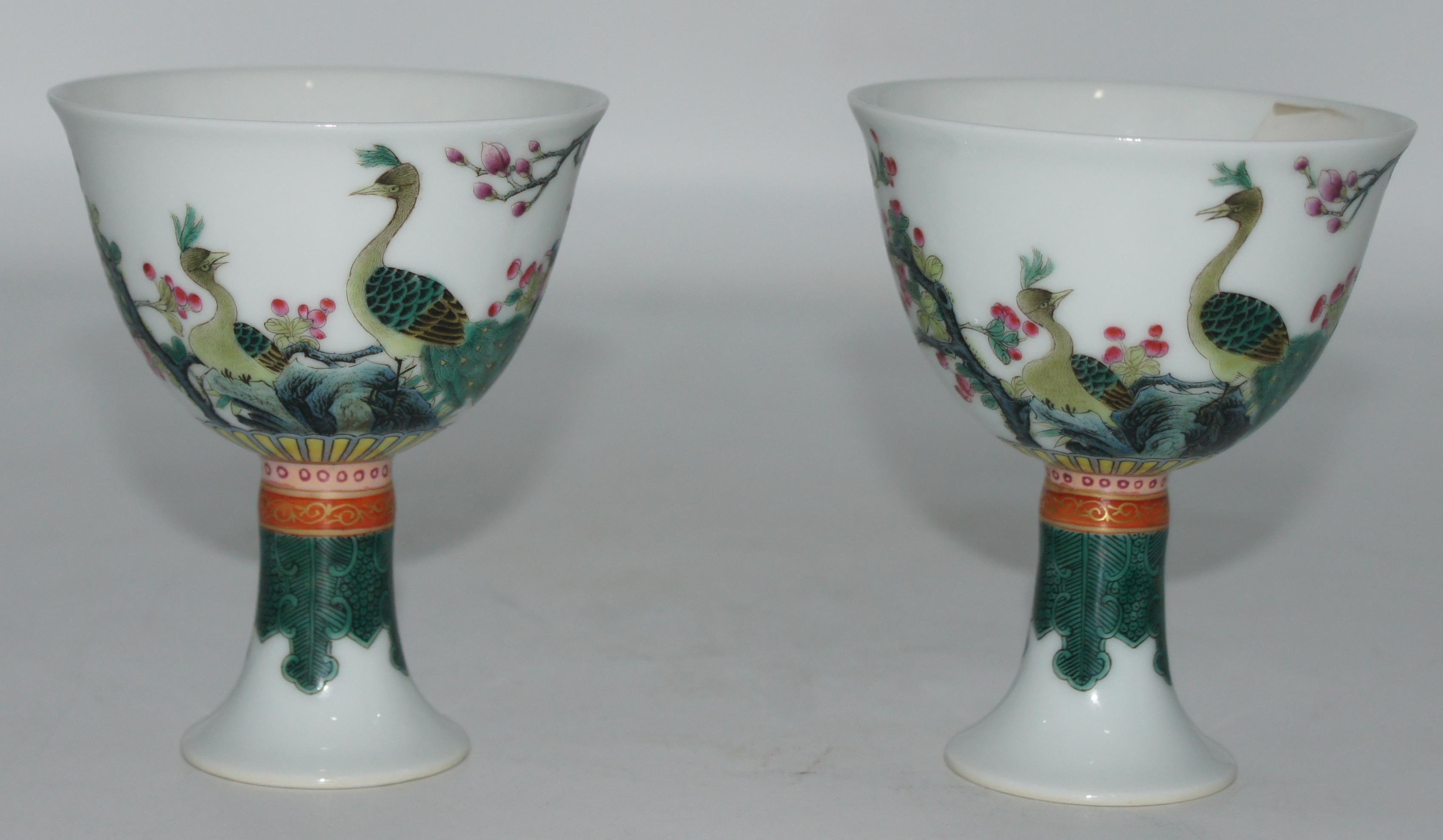 大清乾隆年制款 粉彩花鸟高足杯一对 口7.5*高9.5cm
