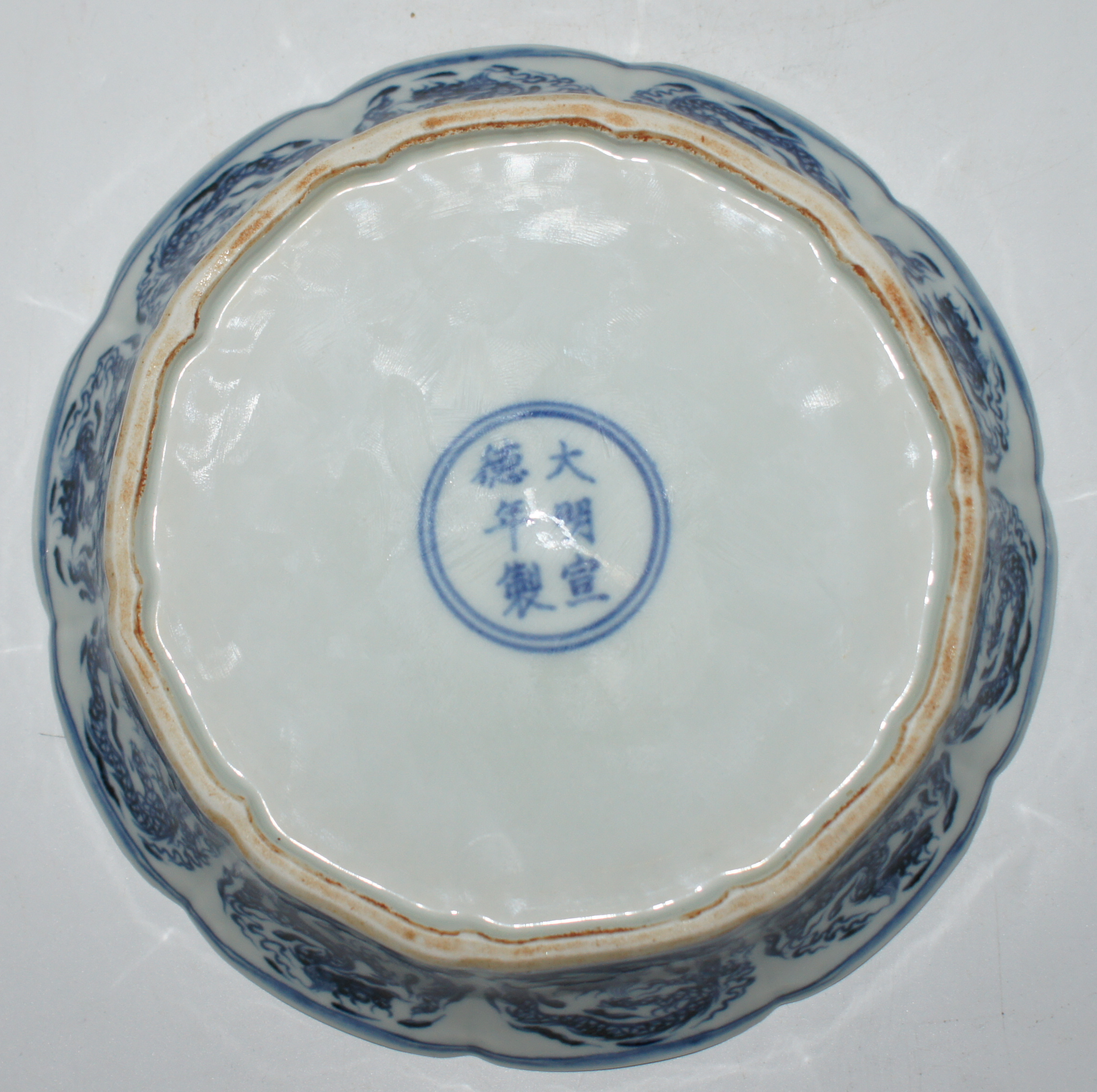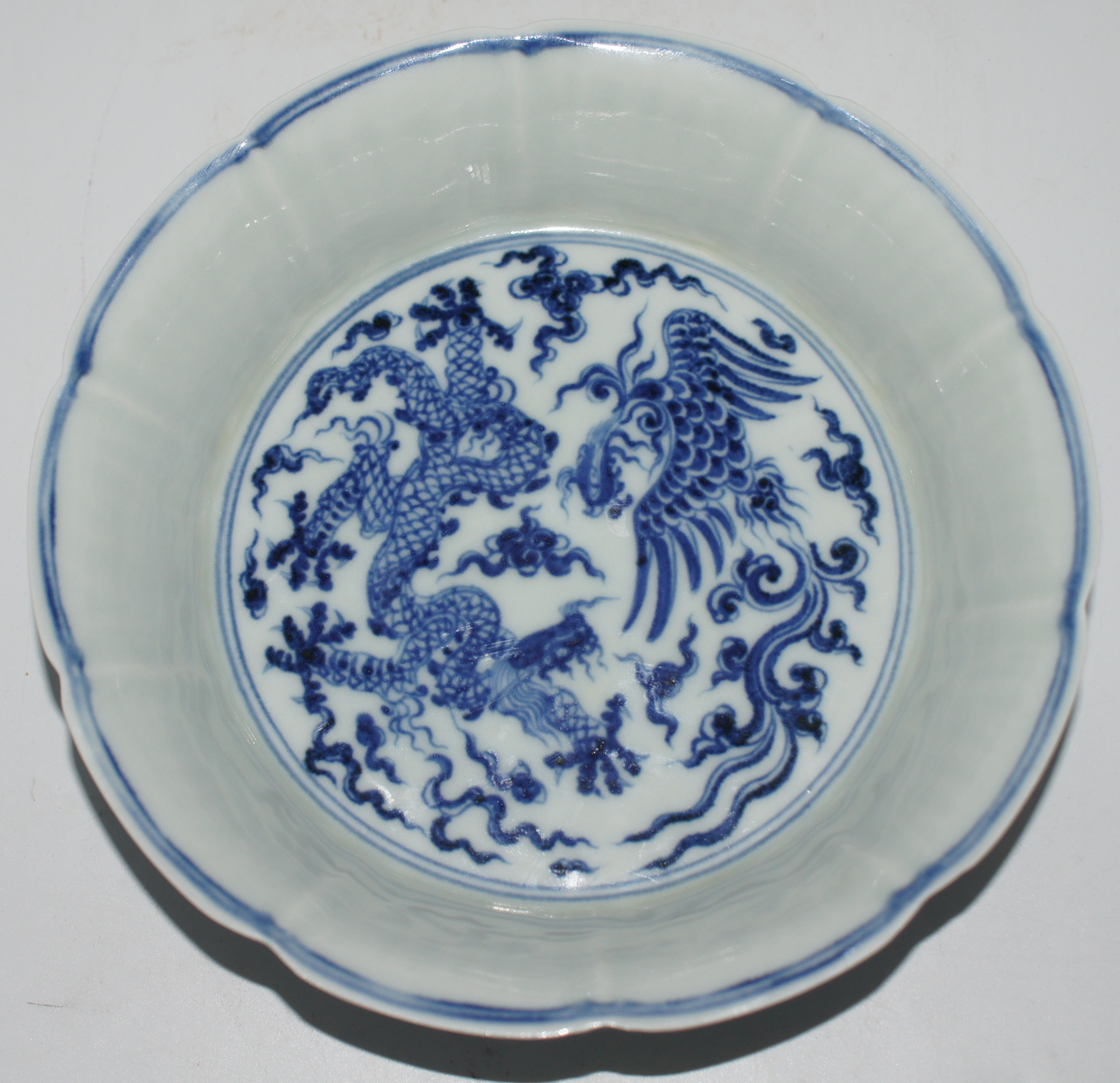 大明宣德年制款 青花龙凤纹荷叶洗 口17.5*高4.5cm