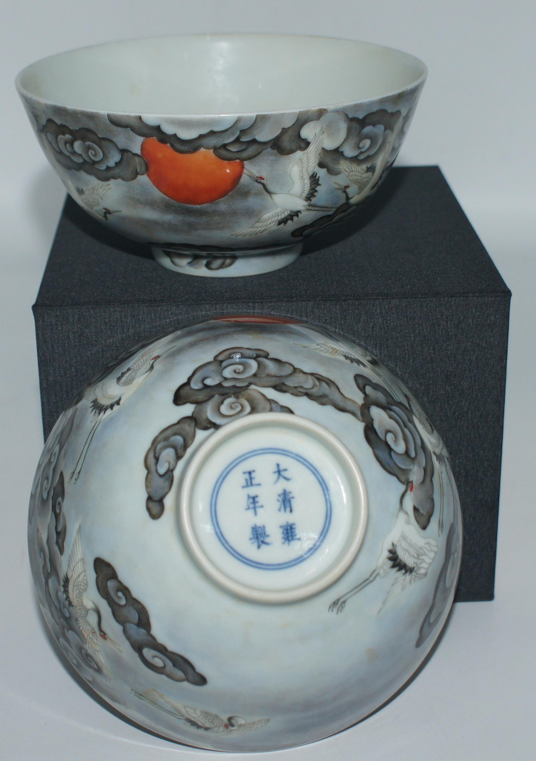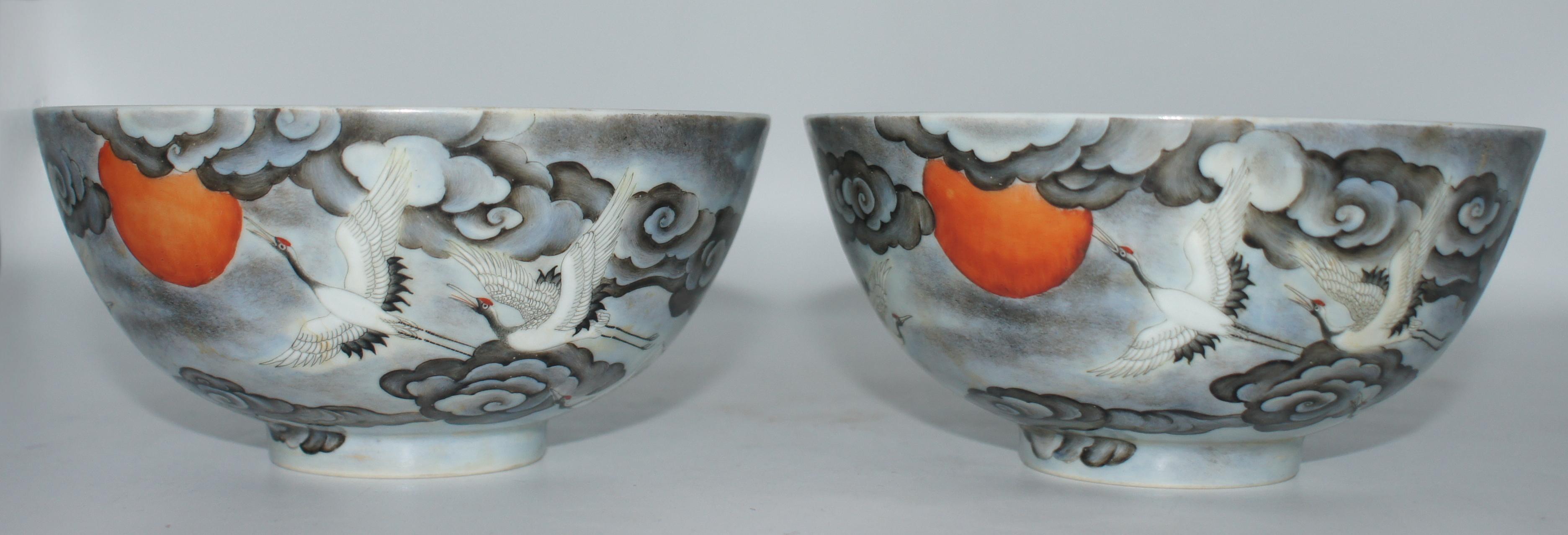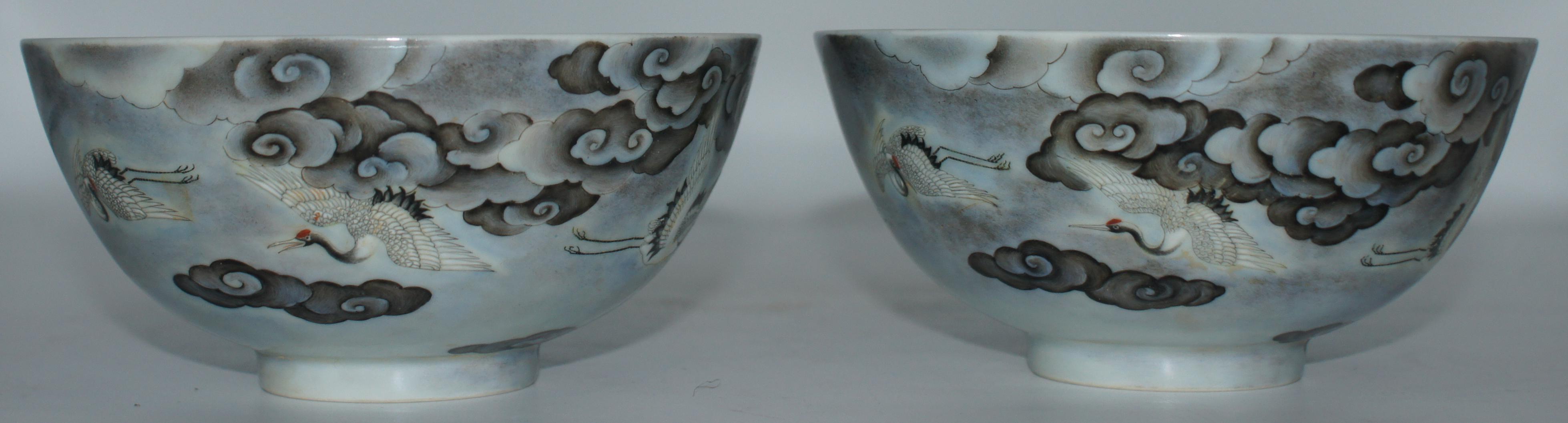 大清雍正年制款 墨彩云鹤纹碗一对 口14.5*高6.5cm