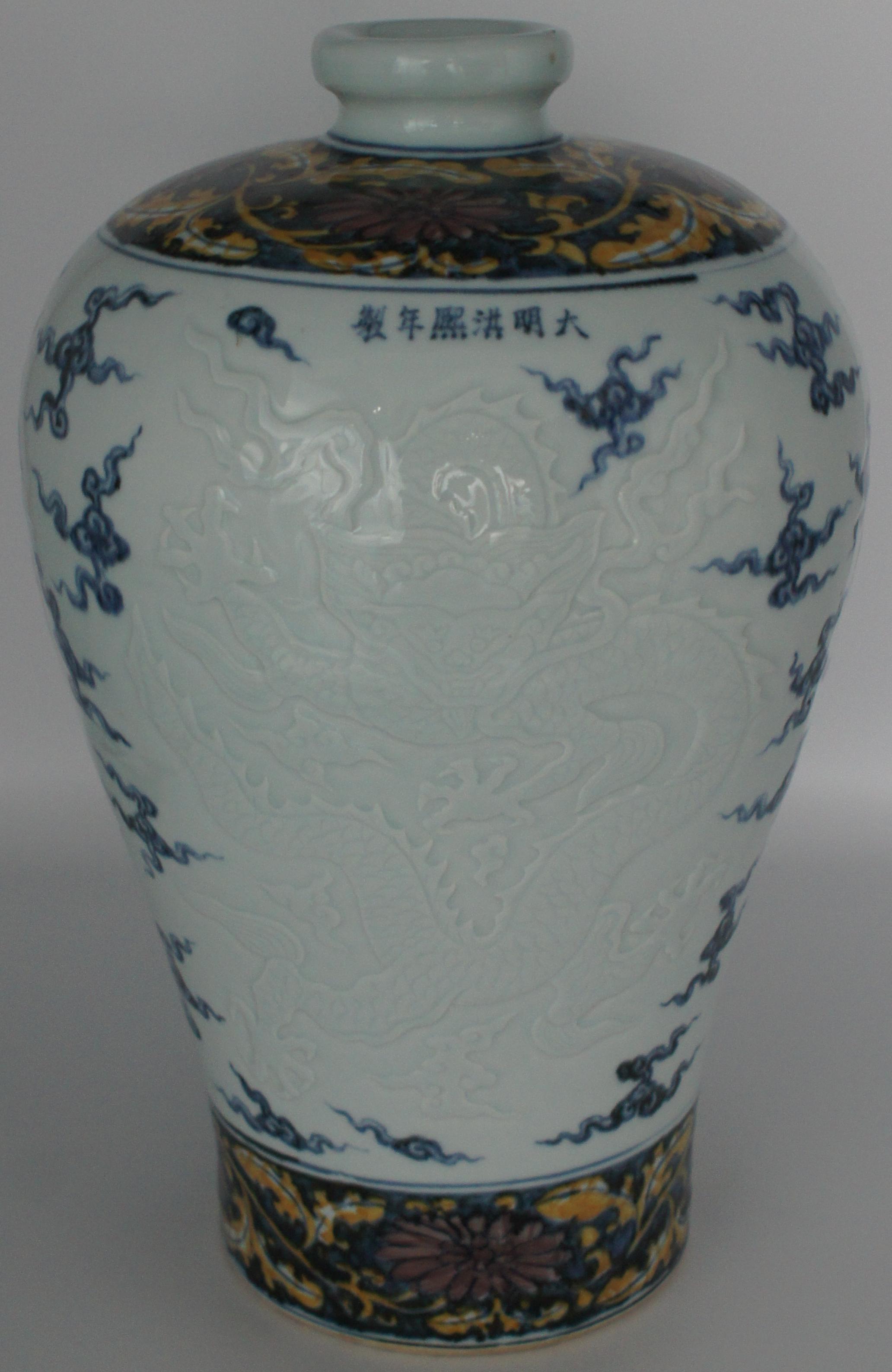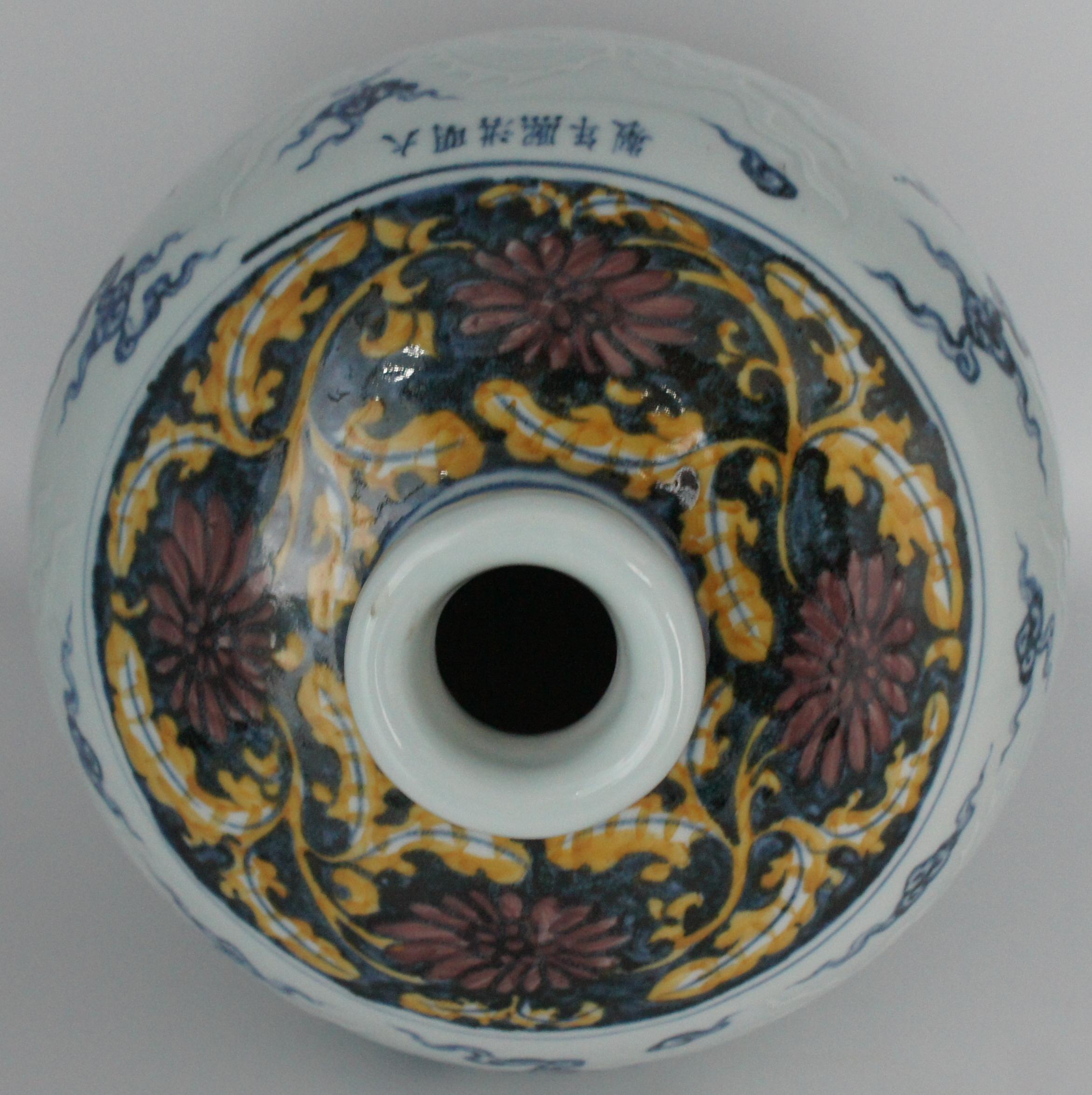 大明洪熙年制款五彩缠枝扁菊刻龙纹梅瓶 高42.5*口8cm