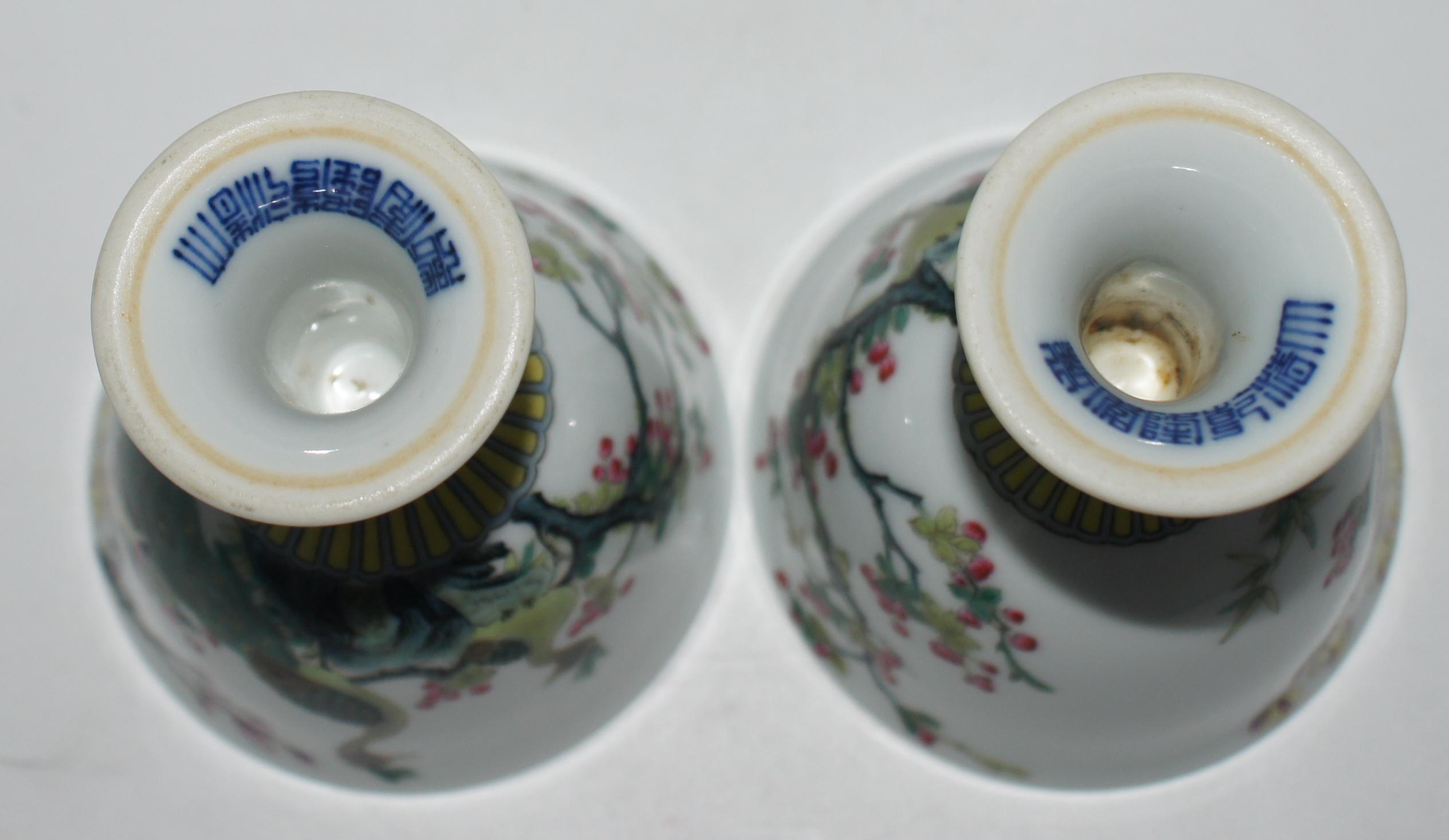 大清乾隆年制款 粉彩花鸟高足杯一对 口7.5*高9.5cm