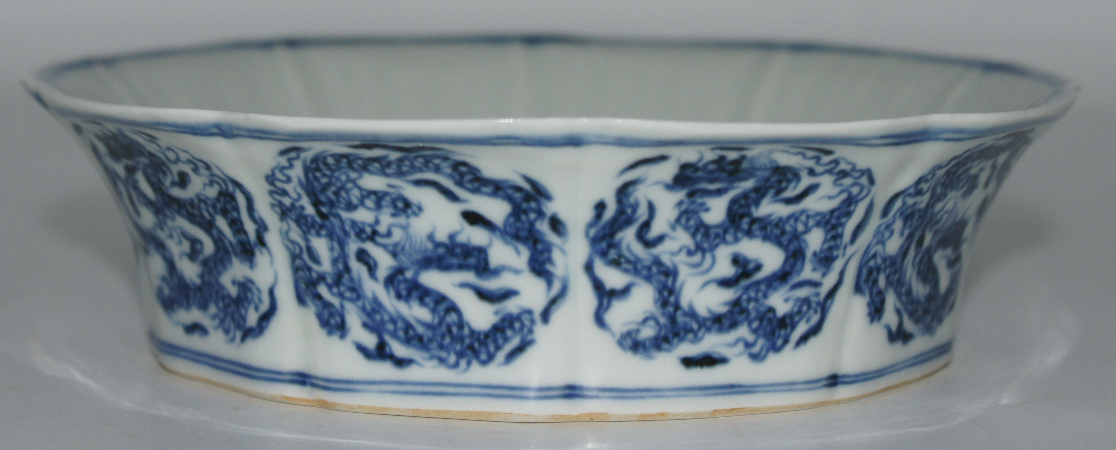 大明宣德年制款 青花龙凤纹荷叶洗 口17.5*高4.5cm