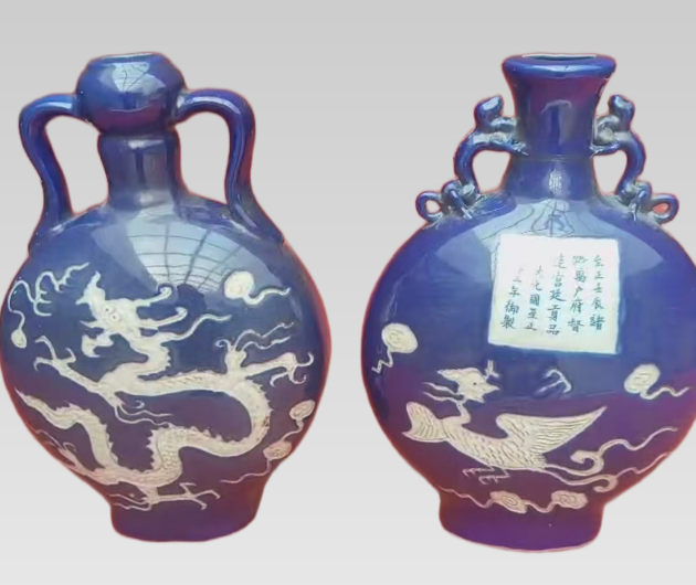 霁蓝釉留白龙凤双龙耳包月瓶一对