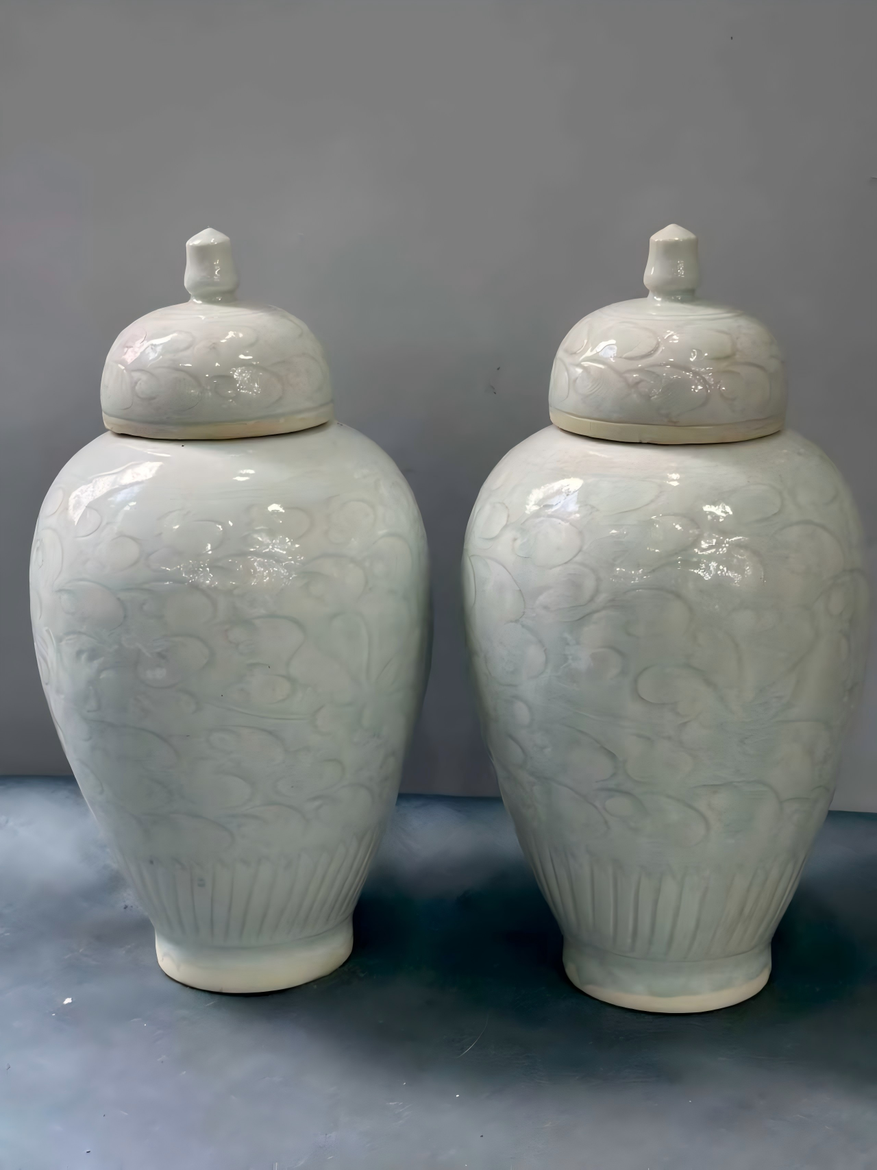 影青暗刻花卉盖罐一对