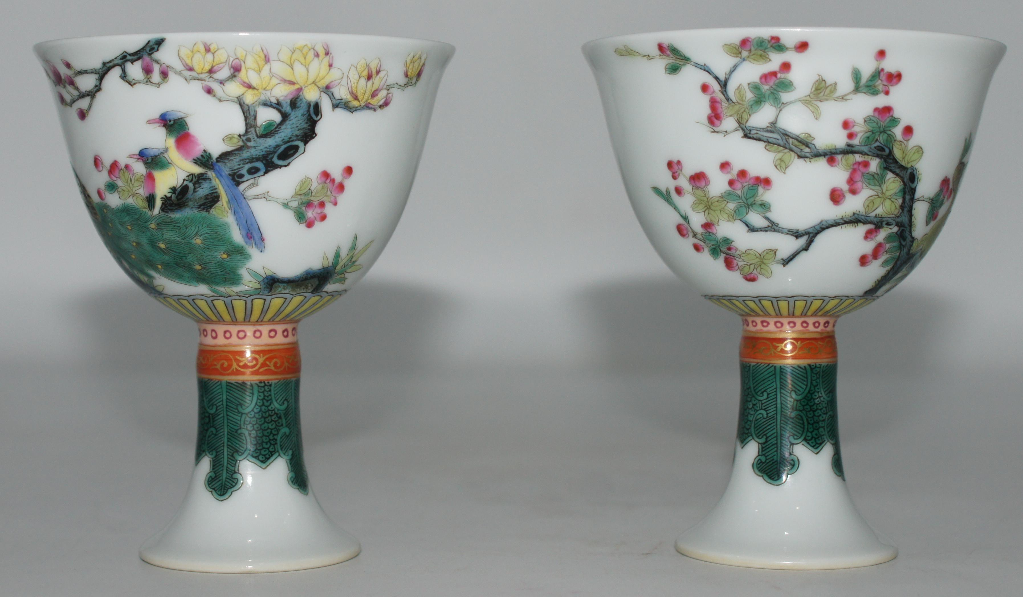 大清乾隆年制款 粉彩花鸟高足杯一对 口7.5*高9.5cm