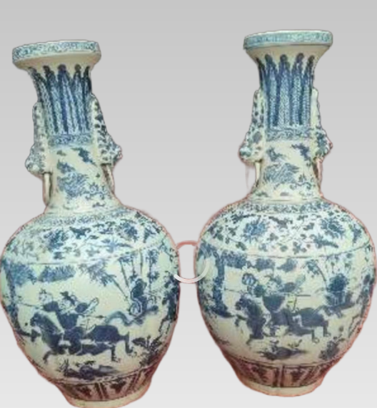 青花双兽钮衔环人物赏瓶一对