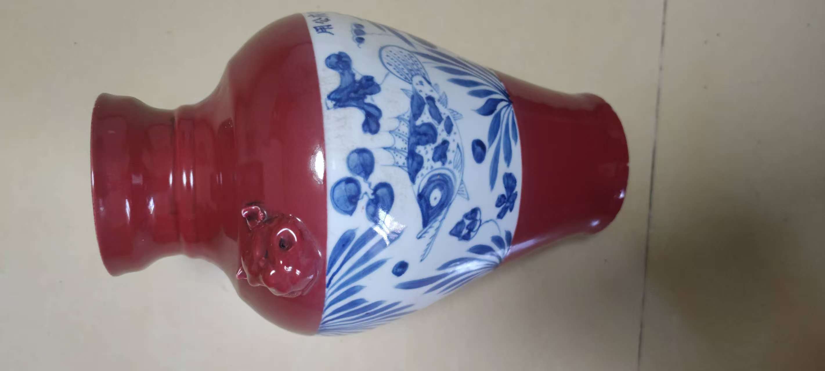 红釉通景青花魚藻纹辅首兽耳尊