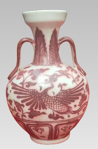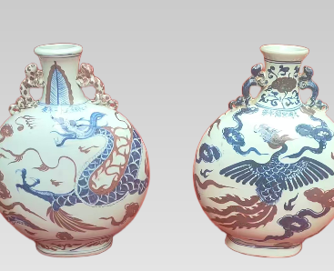 青花釉里红龙凤纹双龙耳包月瓶 一对