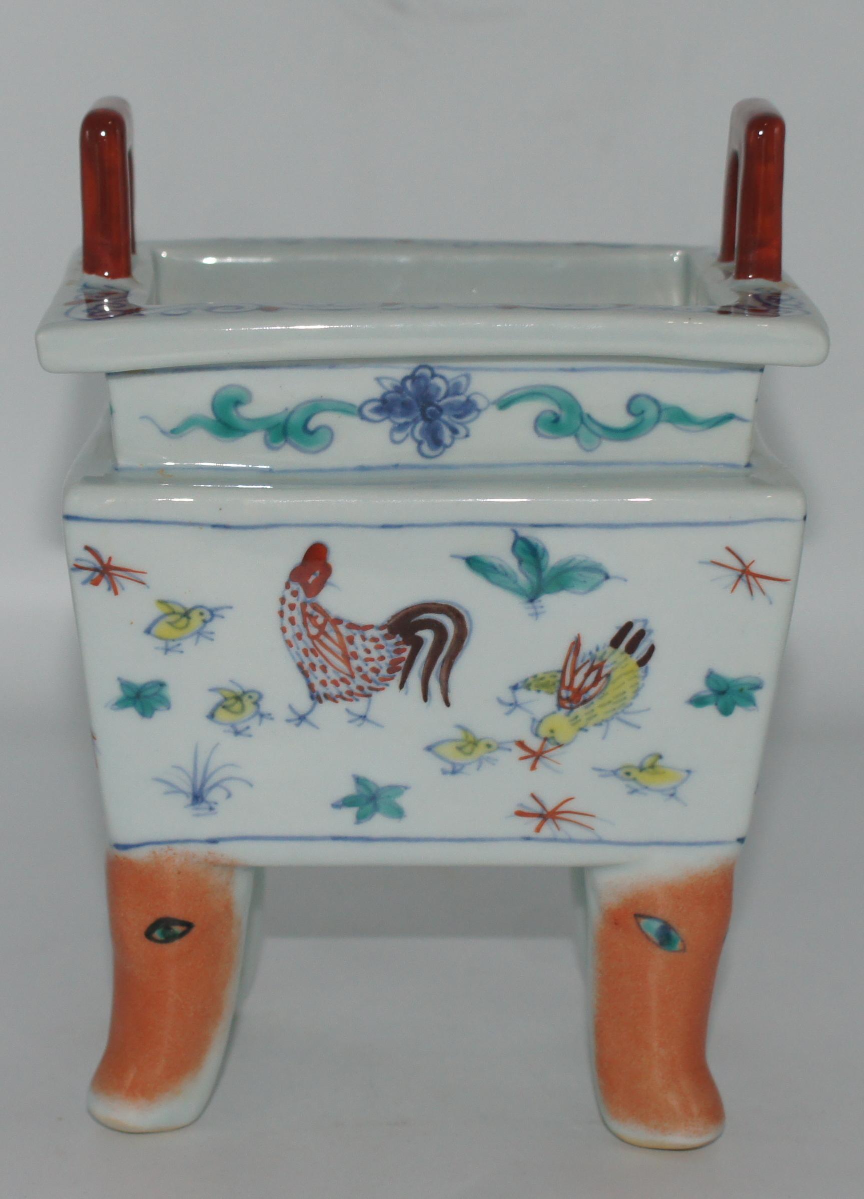 大明成化款 斗彩鸡纹鼎式炉 长14*宽11*高19.5cm