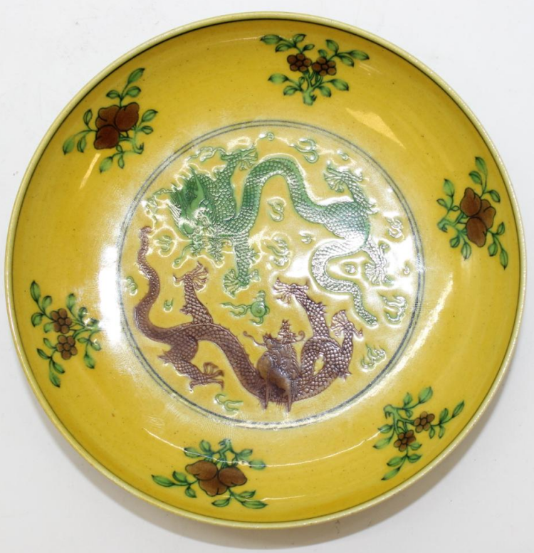 宣统款黄地塑三彩双龙纹盘