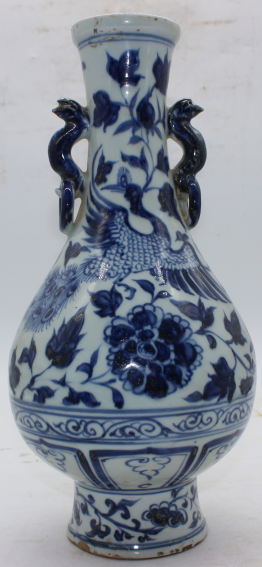 青花凤戏牡丹龙耳瓶